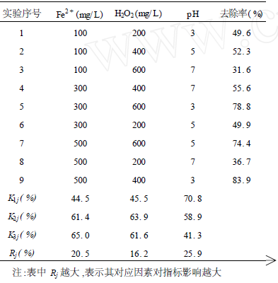 采用正交實(shí)驗(yàn)法來(lái)選擇最佳工藝條件。綜合考慮Fenton 反應(yīng)中各影響因素, 按正交實(shí)驗(yàn)設(shè)計(jì) L9 (34)表[6 ] ,以Fe2 + 濃度、H2O2 濃度、溶液初始pH 值為變量的正交實(shí)驗(yàn),考察Fenton 試劑對(duì)丙烯腈的降解效果,結(jié)果列于表1。