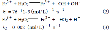 H2O2 在堿性條件下是不穩(wěn)定的,很容易分解, 而在酸性條件下非常穩(wěn)定,幾乎不顯示反應(yīng)性,但在與Fe2 + 共存的條件下,可分解出氧化能力極強(qiáng)的 ·OH(E0 = 2. 8 V) ,其機(jī)理如下: