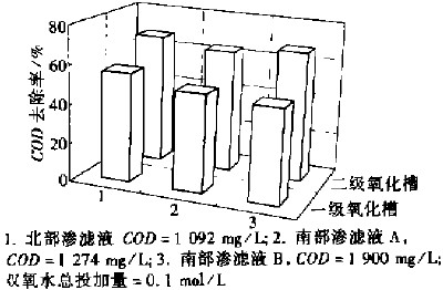 當(dāng)雙氧水的總投加量為0.1 mol/L時(shí),COD去除率接近70%的這一結(jié)果是處理北部填埋場滲濾液得到的,為檢驗(yàn)該條件是否適用于其他晚期滲濾液,對南部填埋場的滲濾液也進(jìn)行了試驗(yàn)。由圖4知,盡管一級氧化槽的去除效果隨著初始COD值的增加而略有降低,但經(jīng)過二級氧化槽后,COD的去除率大致相同。
