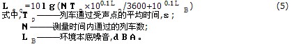 因為輕軌交通系統(tǒng)列車運行速度、長度和輻射噪聲級比較接近,輕軌交通系統(tǒng)營運時間主要集中在晝間(6:00~22:00)時,行車一般以一小時為單位計劃,即測量時間取3600s,則有: