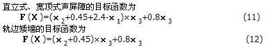 聲屏障成本往往成為設(shè)計成功與否的決定性因素。因此,應以建設(shè)成本為目標,盡量降低成本。聲屏障的建設(shè)費用通常按照聲屏障的面積和長度進行估算,材料費用占聲屏障建設(shè)費用的45%,與長度相應的基礎(chǔ)建設(shè)、排水等大約占35%[6]。由于道床不同軌頂距橋面的高度也不同,同時橋上人行道的高度也與聲屏障建筑高度有關(guān)。因此,取聲屏障建筑高度等于有效高度加上聲源距軌頂高度。寬頂式聲屏障以常用的倒L形為例,綜上所述,取式(11)、式(12)為目標函數(shù),盡可能降低成本。