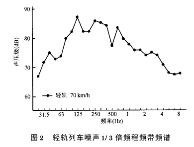 由頻譜可算得Tp為78.42dBA,Teq為66.92dBA,滿足《鐵路邊界噪聲限值及其測量方法》晝間噪聲等效聲級70dBA的規(guī)定,但不滿足Ⅰ類區(qū)域噪聲標準。
