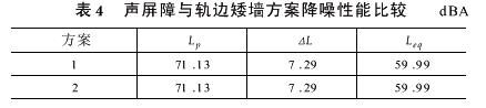 以受聲區(qū)域是工商業(yè)混雜區(qū)為例,其環(huán)境噪聲應符合《城市區(qū)域環(huán)境噪聲標準》Ⅱ類區(qū)域標準,晝間等效聲級應不超過60dBA。其他條件不變。方案1,聲屏障優(yōu)化設(shè)計方案;方案2,軌邊矮墻優(yōu)化設(shè)計方案。計算結(jié)果列入表3、表4。