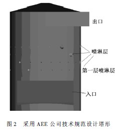 本工程脫硫塔入口煙氣量為3 598 494 m3 / h,采用AEE 公司技術(shù)規(guī)范設(shè)計(jì)的塔形見(jiàn)圖2。脫硫塔入口寬度13. 2 m,入口寬度為脫硫塔直徑的80% ,入口高度為5. 1 m,吸收塔總高度為34. 6 m。