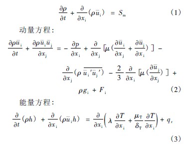 式中:珔ui 為流體的平均流速;珋p 為平均壓力;μ 代表分子黏性系數(shù);cs 為組分s 的平均濃度;ρ 珔ui ′珔uj ′代表由湍流脈動(dòng)引起的雷諾應(yīng)力張量;h 為總焓;λ 為有效熱傳導(dǎo)系數(shù);Sm、Fi、qr 分別代表連續(xù)方程、動(dòng)量方程和能量方程的源項(xiàng)。