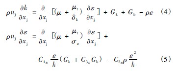 由于脫硫塔內(nèi)存在回流,且計(jì)算區(qū)域較大,因而本文選取了有一定計(jì)算精度且計(jì)算量較小的κ-ε 雙方程湍流模型,其表達(dá)式為[7]: