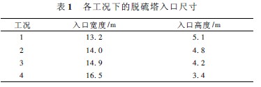 本文共計(jì)模擬了四種工況,分別是入口寬度為吸收塔直徑的80% ( 工況1) ,85% ( 工況2) ,90% ( 工況 3) ,100% ( 工況4)。其中工況1 對(duì)應(yīng)下的塔形為根據(jù)AEE 公司技術(shù)規(guī)范設(shè)計(jì)塔形。各工況下的脫硫塔入口尺寸見(jiàn)表1。