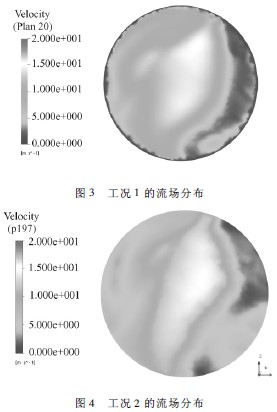 取脫硫塔第一層噴淋層下1 m 處的流場(chǎng)情況進(jìn)行對(duì)比分析,流場(chǎng)情況見(jiàn)圖3 ~ 圖6。從圖中可看出,隨著入口寬度加大,脫硫塔中心區(qū)域的高速區(qū)域越來(lái)越集中,最大速度越來(lái)越大;但是速度低于0 m / s 的區(qū)域面積減少,意味著入口處90°拐角產(chǎn)生的回流區(qū)域面積減少。脫硫塔是利用下落的堿性漿液洗滌煙氣中的酸性氣體,如果煙氣流過(guò)于集中,將會(huì)導(dǎo)致脫硫率降低;然而回流區(qū)域面積減小,將會(huì)導(dǎo)致脫硫率上升。由以上分析可知,工況2 的流場(chǎng)情況最優(yōu)。
