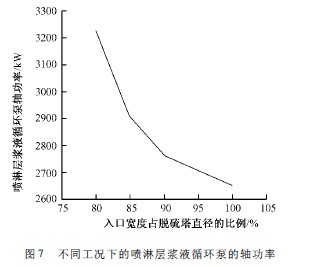 2) 隨著脫硫塔入口寬度加大,可以降低噴淋層漿液循環(huán)泵的揚(yáng)程從而降低漿液循環(huán)泵的軸功率,最后達(dá)到降低整個(gè)脫硫塔的運(yùn)行費(fèi)用的目的。