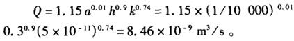 假設(shè)人工防滲采用單層土工膜襯墊,當(dāng)土工膜材料和施工質(zhì)量“一般”時,其破損情況參照有關(guān)資料可以用每4047m2有1個1cm2的小孔來衡量,則其滲透率用伯努利方程計算為3.11×10-4m3/(m2•d)。