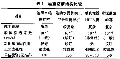 垃圾填埋場垂直防滲結(jié)構(gòu)可以有多種方案,一般可考慮如下幾種:①連續(xù)的水泥攪拌樁;②連續(xù)的水泥膨潤土混合料攪拌樁;③垂直開槽埋設(shè)HDPE膜;④水泥灌漿帷幕。幾種垂直防滲結(jié)構(gòu)比較見表1。