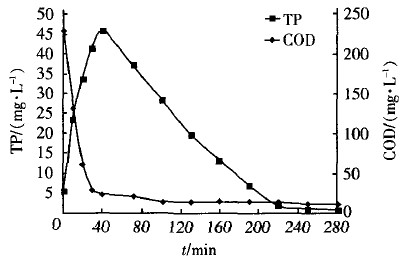 由圖2可知,在厭氧結(jié)束后,COD由228.64 mg/L迅速降至22.61 mg/L,去除率約為90%,與此 同時,總磷由5.62 mg/L上升至46.04 mg/L,釋磷 量為40.42 mg/L,平均釋磷速率為60.63 mg/(L· h)。這主要是因為,反硝化聚磷菌分解體內(nèi)的多聚 磷酸鹽,并以主動運輸方式吸收有機物,將其合成 PHB,同時釋放出無機磷。這樣,釋磷越多則合成的 PHB就越多,表現(xiàn)為被消耗的有機物就越多。COD 的有效快速降解,不僅使PHB得到積累,亦為后續(xù) 的吸磷提供了充足能量,同時也使COD在厭氧段得 到高效去除。而在隨后的好氧段中,反硝化聚磷菌 以NO:-為電子受體,其氧化胞內(nèi)PHB時所產(chǎn)生的 能量被ADP獲得,并結(jié)合外界環(huán)境中的H。P0 合成 ATP,從而進行細胞合成和維持生命活動。此時由 于H PO 被過量攝入細胞體內(nèi),從而達到從污水中 除磷的效果。因此,在好氧段結(jié)束后,反應器中的 COD最終降至10.05 mg/L,去除率達到95.6%,TP 最終降至0.63 mg/L,去除率達到88.8% 。