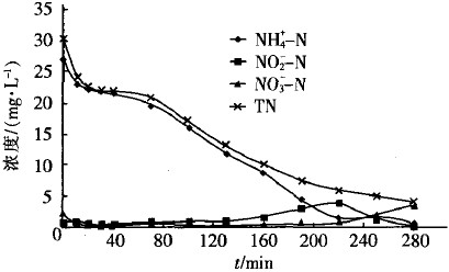 在典型周期內(nèi),短程同步硝化反硝化耦合除磷 過程中NH;一N、NO;一N、NO3-一N以及TN的變 化規(guī)律見圖3。 由圖3可知,在整個典型周期的反應過程中,亞 硝酸鹽氮和硝酸鹽氮始終保持在一個較低的濃度范 圍內(nèi)。亞硝酸鹽氮濃度在初始曝氣時一直很低,經(jīng) 3 h曝氣后,出現(xiàn)了小幅上升,隨后又逐漸降低;而 硝酸鹽氮濃度只在反應結(jié)束時出現(xiàn)了小幅上升。這 主要是由于氧擴散的限制,形成了DO濃度梯度,加 上體系內(nèi)的DO濃度較低,氧氣無法深入到微生物 絮體內(nèi)部,從而出現(xiàn)“表里不一”的現(xiàn)象,為硝化和 反硝化反應的進行分別提供了有利環(huán)境,實現(xiàn)了同 步硝化反硝化。由于微生物絮體外表面的DO濃度 較絮體內(nèi)部的高而形成了好氧區(qū),以硝化菌為主,發(fā) 生了硝化反應,而氧氣濃度較低使硝化反應又只能 停留在亞硝酸鹽階段,出現(xiàn)了短程硝化現(xiàn)象;絮體內(nèi) 部則由于氧傳遞受阻及外部氧大量消耗而形成缺氧 區(qū),反硝化菌占優(yōu)勢,發(fā)生了反硝化反應,從而實現(xiàn) 了短程同步硝化反硝化。從圖3還可知,在典型周 期內(nèi),氨氮濃度隨運行時間的延長而降低,從反應初 始時的27.05 mg/L降至0.51 mg/L,去除率達到 98%。在反應初期,氨氮濃度有所下降,這是由稀釋 效應引起的。而總氮的降解曲線與氨氮的降解曲線 大致相同,這是因為進水氮源主要為氨氮,且在整個 反應過程中,由氨氮轉(zhuǎn)化的亞硝酸鹽氮與硝酸鹽氮 一直沒有得到較多積累,使總氮始終保持與氨氮同 樣的下降趨勢,由進水時的30.19 mg/L降至出水時 的3.95 mg/L,去除率達到87%。