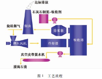 燒結(jié)尾氣由增壓風(fēng)機(jī)升壓后經(jīng)冷卻器進(jìn)入吸收塔,反應(yīng)后煙氣經(jīng)除霧器除霧后通過煙囪排放大氣。工藝流程如圖1 所示。吸收劑采用250 目的石灰石粉,副產(chǎn)物為石膏。