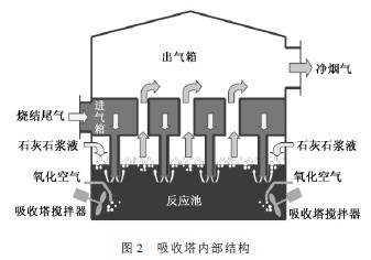 煙氣進(jìn)入進(jìn)氣箱后通過浸沒在反應(yīng)池中的曝氣管噴入漿池中,與石灰石漿液充分接觸,使氣液兩相高度旋沖混合,煙氣中SO2 與碳酸鈣進(jìn)行反應(yīng),生成亞硫酸鈣。