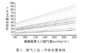 吸收塔進(jìn)氣箱溫度有波動性、滯后性的特點(diǎn),因此,吸收塔進(jìn)氣箱宜設(shè)置2 ~ 3 個的測溫儀表,便于更精確全面地獲知煙氣溫度。此外應(yīng)根據(jù)理論計(jì)算繪制出煙氣工況- 冷卻水量曲線圖( 圖3) ,當(dāng)溫度有明顯上升趨勢時,應(yīng)提前調(diào)整一級冷卻噴水量( 該曲線在運(yùn)用中需根據(jù)實(shí)際情況進(jìn)行修正)。溫度報警值也應(yīng)比允許值低2 ~ 3 ℃。
