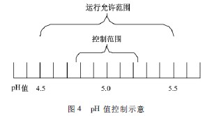 由于吸收塔的持漿量很大,相對于煙氣量變化的速率,漿液pH 值發(fā)生變化的速率要緩慢得多,因此 pH 值的延滯與慣性較大。為克服該缺點(diǎn),在電廠脫硫中一般將鍋爐負(fù)荷和SO2 濃度作為pH 值控制的前饋信號參與控制[3],但燒結(jié)煙氣的波動頻繁、幅度大,不宜采納該方法,而應(yīng)采用縮小pH 值控制范圍,留足安全余量的方式來解決( 圖4)。