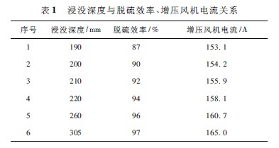 曝氣管浸沒深度是決定系統(tǒng)脫硫效率和能耗的一項(xiàng)重要指標(biāo)。曝氣管浸沒深度越淺,脫硫效率越低,另一方面增壓風(fēng)機(jī)的電流也越小,整個系統(tǒng)的能耗也越低。浸沒深度越深,脫硫效率越高,但增壓風(fēng)機(jī)的電流也越大,整個系統(tǒng)的能耗也越高?梢姡ㄟ^調(diào)整曝氣管浸沒深度,找出既經(jīng)濟(jì)又能滿足環(huán)保要求的運(yùn)行工況是很有必要的。表1 為某燒結(jié)脫硫工程中曝氣管浸沒深度與脫硫效率、增壓風(fēng)機(jī)電流關(guān)系表。