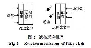 流化床焚燒工藝的固有缺點(diǎn)是煙氣含塵量大,除塵階段采用布袋除塵器效果較好。除塵濾布由玻璃纖維制成,受玻璃纖維耐熱強(qiáng)度限制,一般尾氣溫度控制在250 ℃左右,在這個(gè)環(huán)境溫度下不利于二惡英生成[ 3 ] 。袋式除塵器反應(yīng)器的濾布可以吸附脫酸塔中的反應(yīng)生成物,未反應(yīng)的消石灰粉和活性碳粉末,在濾布上形成一層反應(yīng)膜,大大增加了反應(yīng)的比表面和反應(yīng)時(shí)間,從而使得未在脫酸塔內(nèi)反應(yīng)的酸性氣體,未被活性碳吸附的二惡英、重金屬,得到二次凈化(濾布反應(yīng)機(jī)理見圖2) 。其他一些顆粒物、飛灰,在外層形成一層濾餅,這層濾餅會(huì)影響布袋除塵器的工作效率,所以在一定時(shí)間內(nèi)要清理這些灰塵。清理所用到的方法是脈沖式反沖洗。當(dāng)濾餅增到一定厚度,除塵器的壓差上升到一定值時(shí),自動(dòng)控制系統(tǒng)發(fā)出脈沖清灰信號(hào),向布袋內(nèi)面噴入壓縮空氣。由于壓縮空氣的沖擊力作用,布袋外表面的濾餅剝落,掉入除塵器底部料斗,安裝于料斗口的排灰閥將沉積于料斗的灰塵排出布袋除塵器。收集于布袋外表面的煙塵落入錐形的灰斗內(nèi)再經(jīng)雙層排灰閥排出,清潔空氣進(jìn)入除塵器頂部的清潔氣箱, 由風(fēng)機(jī)通過總出口導(dǎo)管抽出。壓縮空氣由電子控制的供氣系統(tǒng)供給,在布袋里形成高能振動(dòng)波,同時(shí)高效率文丘里管使處理過的干凈氣體沖進(jìn)布袋,對(duì)布袋形成二次清灰。