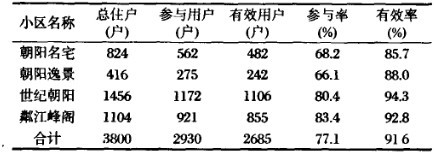 試驗(yàn)開(kāi)展時(shí)間從2009年3月~4月,歷時(shí)2個(gè)月。四個(gè)試點(diǎn)居民小區(qū),總住戶3800戶,入住率平均90%以上。各小區(qū)居民參與情況見(jiàn)表3,參與用戶指在試點(diǎn)期間與公司簽訂協(xié)議自愿加入的用戶,有效用戶指簽署協(xié)議后一周之內(nèi)開(kāi)始回收的用戶。表3顯示,用戶參與率達(dá)到77.1%,有效用戶達(dá)到91.6%,說(shuō)明這種回收模式很容易被居民所接受。