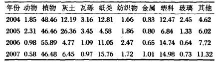 表2為成都市城區(qū)近幾年生活垃圾成分變化情況?梢钥闯鲋参、灰土、塑料、紙類在生活垃圾中占絕大比重,近年來(lái)變化比較明顯;可回收成分的比例,尤其是紙類和塑料類在近兩年不斷地增加,2007年僅這兩類就占垃圾總量的30.74%。