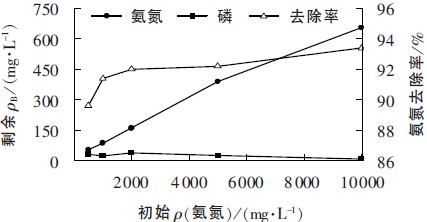 圖1表示氨氮初始質(zhì)量濃度在500 ~ 10 000 mg / L 范圍內(nèi)變化時(shí)對(duì)氨氮沉淀效果的影響, 其中 試驗(yàn)固定條件: 溫度為25 ℃、pH 值為10、沉淀 劑添加比例n(Mg) ∶ n(N) ∶ n(P) = 1 ∶ 1 ∶ 1、反應(yīng)時(shí)間20 min。