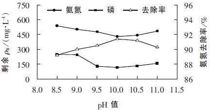 圖2 表示pH 值的影響, 試驗(yàn)固定條件: 氨氮 初始質(zhì)量濃度1 000 mg / L、溫度25 ℃、沉淀劑添 加比例n(Mg) ∶ n(N) ∶ n(P) = 1 ∶ 1 ∶ 1、反應(yīng)時(shí)間20min。