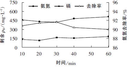 圖3 表示反應(yīng)時(shí)間的影響, 試驗(yàn)固定條件: 氨 氮的初始質(zhì)量濃度為1 000 mg / L、溫度為25 ℃、 pH 值為10、沉淀劑添加比例n(Mg) ∶ n(N) ∶ n(P) = 1 ∶ 1 ∶ 1。 圖3 表明, 當(dāng)反應(yīng)時(shí)間為10 min 時(shí), 氨氮去 除率已達(dá)90.8%; 將反應(yīng)時(shí)間由10 min 延長至60 min, 對(duì)氨氮的去除率幾乎沒有影響, 均為90% 左 右。因此, 在反應(yīng)進(jìn)行10 min 后, 沉淀反應(yīng)已基 本完成, 為保證沉淀反應(yīng)充分完成, 反應(yīng)時(shí)間以20 min 較為適宜。