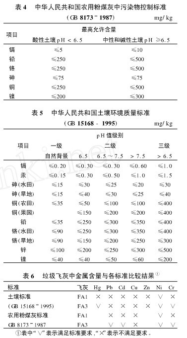 表2、表3給出了一些國家關(guān)于二惡英的控制標(biāo)準(zhǔn),表4、表5為我國關(guān)于重金屬控制及質(zhì)量標(biāo)準(zhǔn),表6為兩種飛灰重金屬含量與上述標(biāo)準(zhǔn)進(jìn)行比較的結(jié)果。