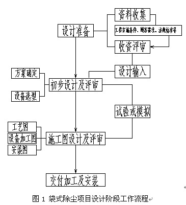 一個燃煤電廠鍋爐煙氣袋式除塵項目,完整的設(shè)計工作流程應(yīng)該如圖1。需要特別指出的是,該流程圖中的“試驗或模擬”是不可缺少的一個環(huán)節(jié),特別是關(guān)系到除塵器性能的氣流組織和清灰系統(tǒng)時,做試驗或計算機模擬是必要的步驟。試驗的方法是利用相似理論,按一定比例(保證幾何相似、運動相似和動力相似)建立物理模型,進行氣流組織和氣流分布裝置的試驗;而計算機數(shù)值模擬是以計算流體力學(xué)為基礎(chǔ),以商用流體軟件為平臺,根據(jù)實際工程建立模型,進行數(shù)值計算,并以圖形化界面的直觀方式表達。