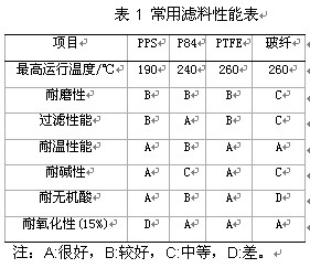根據(jù)上述要求,結(jié)合燃煤電廠煙氣特性,可以按下表粗略選擇濾料材質(zhì):