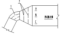 圖3 某電廠袋式除塵器導(dǎo)流板和氣流分布板示意圖(1.進口彎煙道內(nèi)導(dǎo)流板  2.進口喇叭口內(nèi)氣流分布板)