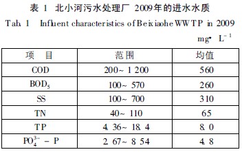 2009年北小河污水處理廠全年的進(jìn)水水質(zhì)情況見(jiàn)表1。