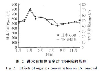 在整個(gè)MBR系統(tǒng)中, 對(duì)TN 的去除主要發(fā)生在生化反應(yīng)區(qū), 影響TN 去除的因素主要有: 進(jìn)水中的有機(jī)物濃度、內(nèi)回流比及由好氧區(qū)回流到缺氧區(qū)的溶解氧( DO )濃度。因本系統(tǒng)好氧區(qū)的DO 濃度采用在線探頭反饋控制, 其值基本維持在1. 5 ~ 2. 0 mg /L之間, 比較穩(wěn)定, 因此影響系統(tǒng)中TN 去除的因素主要為進(jìn)水有機(jī)物濃度和內(nèi)回流比。