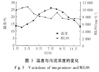由于MBR 系統(tǒng)中設(shè)有化學(xué)除磷設(shè)施, 因此只討論溫度與MLSS對(duì)有機(jī)物和氨氮去除的影響。北小河污水處理廠位于北方地區(qū), 2009年最低運(yùn)行水溫在13℃左右, 全年有4個(gè)月的水溫< 15℃。生物硝化反應(yīng)可以在4~ 45℃的范圍內(nèi)進(jìn)行, 而亞硝酸菌的最佳生長(zhǎng)溫度為35℃, 硝酸菌的最佳生長(zhǎng)溫度為35~ 42℃, 較低的溫度會(huì)影響硝化菌的活性[ 3] 。圖3為2009年MBR系統(tǒng)中水溫與MLSS的變化。