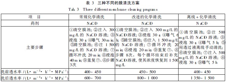 為了獲得較好的化學(xué)清洗效果, 對(duì)化學(xué)清洗方案進(jìn)行了改進(jìn), 將化學(xué)藥劑浸泡并曝氣的時(shí)間由30 m in提高到6 h; 同時(shí)在清洗過(guò)程中發(fā)現(xiàn), 每個(gè)循環(huán)后NaC lO濃度都有一定的降低, 特別是在第一個(gè)循環(huán)后, 為此在每個(gè)循環(huán)結(jié)束后, 手動(dòng)補(bǔ)藥將NaC lO 濃度恢復(fù)到初始值。改進(jìn)的化學(xué)清洗方案可以將膜的透水率恢復(fù)到800~ 1 000 L / (m2 · h· MPa)。但通過(guò)將膜架移出觀察發(fā)現(xiàn), 仍有局部濾餅層未被清洗掉, 為了較徹底地恢復(fù)膜的透水性能, 將超濾膜進(jìn)行手動(dòng)離線清洗, 并輔以簡(jiǎn)單的化學(xué)清洗, 離線清洗后膜的透水率可恢復(fù)到1 350~ 1 500 L / ( m2 · h· MPa), 透水性能得到了較理想的恢復(fù)。