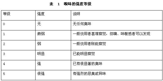 通常對水中的嗅味進(jìn)行定性、定量分析是較為困難的,《生活飲用水標(biāo)準(zhǔn)檢定法》(GB575085)關(guān)于嗅味和味的測定,采取以適當(dāng)詞語描述,并按六級記錄強(qiáng)度的方法見表1。