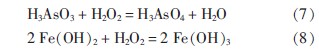 由于砷酸鐵不溶解于水, 而亞砷酸鐵在水中還有一定的溶解度, 因此需要將廢水中的三價(jià)砷氧化成五價(jià)砷后進(jìn)行處理才能獲得滿意的效果。另外,生產(chǎn)中使用的鐵鹽并不是三價(jià)鐵, 而是FeSO4, 也需要將其氧化。為了不引入新的雜質(zhì), 生產(chǎn)中選用了雙氧水作氧化劑。