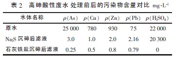 含砷酸性廢水經(jīng)兩段硫化鈉法加一段石灰-氧化-鐵鹽法除砷處理后, 主要有害元素砷的質(zhì)量濃度穩(wěn)定控制在0.5mg/L 以下, 平均0.27mg/L, 其它有色重金屬的脫除率也達(dá)到《污水綜合排放標(biāo)準(zhǔn)》(GB 8978-1996)規(guī)定的要求, 可以供生產(chǎn)循環(huán)使用, 或中和至pH < 9 后外排。高砷酸性廢水處理前后的污染物含量對比如表2。