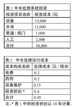 既然中水的“出龍頭”成本的大頭是在輸水環(huán)節(jié)上,若能降低甚至免除此環(huán)節(jié)成本,必然能徹底解決中水推廣難的問題。具體辦法就是分散式中水處理,就地產(chǎn)生的廢水,就地處理,就地回用。在洗車店就地處理洗車廢水,并回用于洗車,中水“出龍頭”價完全可控制在每噸水1~1.5 元,成本詳情見表1 和2。相對于居民用自來水價,還能產(chǎn)生2~2.4 元的經(jīng)濟(jì)效益,洗車店盜用居民用自來水就完全沒有了經(jīng)濟(jì)動機(jī),政府的監(jiān)督所遇到的阻力將大為降低,監(jiān)管將更為有效。