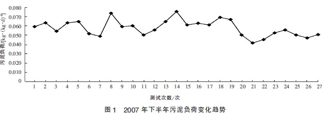 由于印染廢水可生化性差[ρ(BOD5):ρ(COD)≈ 0.3],設(shè)計(jì)時(shí)采用低負(fù)荷的延時(shí)曝氣法,單位MLSS 的BOD5 污泥負(fù)荷為0.12kg/(kg·d),每周測(cè)定1次 BOD5 值,半年測(cè)定27次,實(shí)際運(yùn)行的負(fù)荷如圖1。