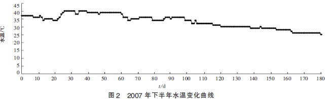圖2為2007年下半年水溫變化曲線。每天測(cè)定 1次,半年連續(xù)測(cè)定183次,結(jié)果表明:水溫非常適宜絲狀菌生長(zhǎng)。當(dāng)水溫超過(guò)39℃時(shí),SVI值呈下降的趨勢(shì),水溫下降后SVI值逐漸上升到150mL/g以上。說(shuō)明絲狀菌的生長(zhǎng)繁殖受溫度的影響大于菌膠團(tuán)[5]。