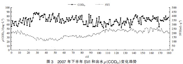 2007年下半年SVI和出水CODCr 質(zhì)量濃度變化趨勢(shì)如圖3所示。據(jù)2007年下半年和2008年上半年觀察,污泥微膨脹時(shí)出水清澈,SS質(zhì)量濃度小于5mg/L。