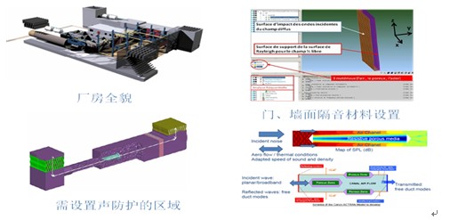 工廠噪聲控制技術中,可以通過:(1)降低噪聲源,如選用噪聲小的設備、 安裝時加減震墊等;(2)通過吸聲材料、穿孔板、消聲器等對噪聲能量進行吸收和衰減(3)控制噪聲的傳播途徑,如給噪聲源加裝隔聲罩、在噪聲的傳播途徑上加隔聲屏障,等等。工廠噪聲源復雜,同時涉及噪聲的傳播、反射、衍射和吸收等問題,各類噪聲控制技術需要對噪聲及其傳遞特性、控制效果進行有效評估,因此Actran軟件包在工廠噪聲相關的預測和治理中具有廣闊的應用空間: