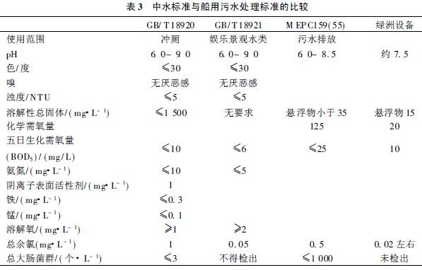 如果國內(nèi)船舶設(shè)計要考慮中水回用, 只能采用現(xiàn)有執(zhí)行的國家標準, 與中水回用及船舶有關(guān)聯(lián)的規(guī)范有: 《城市污水再生利用城市雜用水水質(zhì)《GB/ T 18920-2002[ 1] , 《城市污水再生利用景觀環(huán)境用水水質(zhì)》GB/ T18921-2002[ 2] 的規(guī)定, 其各項指標的對比見表3。