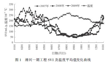 清河污水處理廠一期工程自2009 年起連續(xù)兩年發(fā)生嚴重的污泥膨脹, 第一次為2009 年2 月, 4 月恢復(fù); 第二次為2009 年12 月, 2010 年2 月恢復(fù)。2007~ 2009 年污水處理廠SVI 數(shù)據(jù)如圖1 所示。可見2 月污泥膨脹嚴重時, SVI 平均值大約在 350 mL/ g , 同時曝氣池布滿黃色泡沫, 二沉池沉降性能極差, 出水絮體很多。