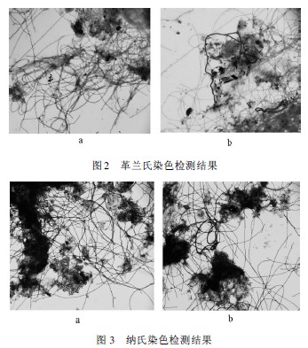 對膨脹污泥進行了革蘭氏染色和納氏染色分析, 具體檢測結(jié)果見圖2、圖3。