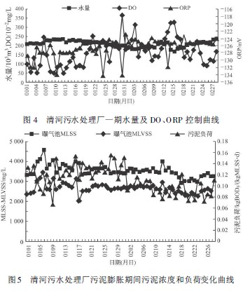 從圖4 與圖5 可看出, 污泥膨脹前后進水水量、污泥負荷及DO 變化并不明顯, 污泥濃度降低了 10% 左右, 從這些參數(shù)變化趨勢上看不出明顯差距。