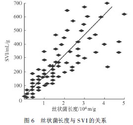 ( 4) 絲狀菌分析。絲狀菌長度是指活性污泥單位體積內(nèi)絲狀菌的長度, 該指標用來表示絲狀菌含量( 見圖6) 。一般將絲狀菌長度大于104 m/ g 的污泥劃為膨脹污泥。