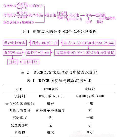 化學沉淀法是目前應用最普遍的廢水處理方法,常用分流-綜合2段處理,其流程見圖1。常用的沉淀劑有氫氧化鈉、硫化鈉、石灰和碳酸鈣。不同的金屬離子形成氫氧化物的最佳pH值不同,某一金屬離子形成氫氧化物的最佳pH值可能是另一金屬重新溶解的條件。因此,用堿沉淀法處理廢水的有效性并不很高,而且形成的氫氧化物沉淀遇酸時還會再溶解,從而造成二次污染。為了克服這一缺點,國內(nèi)已開始生產(chǎn)高分子重金屬捕集沉淀劑(DTCR)。DTCR是由多個二硫代氨基甲酸鹽作為螯合基團的高分子聚合物,分子量為10~15萬,能與多種金屬離子形成非常穩(wěn)定的不溶性沉淀,處理后的排出水中重金屬含量低于0.5mg/L,完全符合國家排放標準,而且可以一次除盡多種重金屬離子,所形成的沉渣遇酸不會再分解,無二次污染,也不會像硫化物遇酸形成污染環(huán)境的硫化氫氣體[2,4]。DTCR沉淀法的主要缺點是處理費用高,DTCR運輸與保存困難,形成的污泥難以利用,貴重金屬難以回收利用。DTCR沉淀法處理混合電鍍廢水的流程見圖2,其與堿沉淀法的對比見表1。